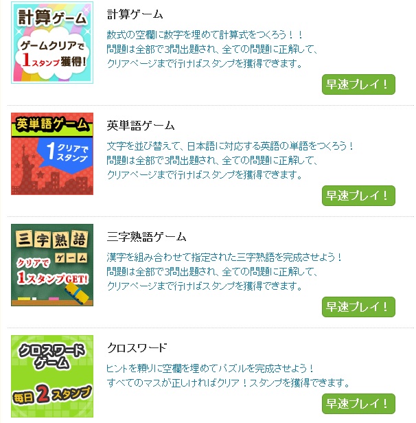 :[ゲームスタート]→(並び替え)→[回答する]→[次の問題へ]→(並び替え)→[回答する]→[次の問題へ]→(並び替え)→[回答する]→[3問クリア!クリックでスタンプゲット!]
