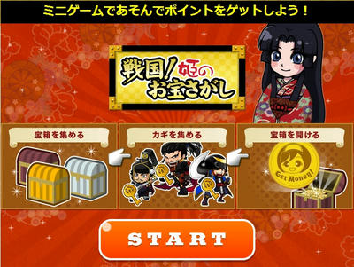 [START]→洞窟探検[START]→{分かれた道の進む方向を選ぶ(3択)→(宝箱の有無の判定)[NEXT]}×約8→武将バトル[START]→{攻撃する方向を選ぶ(3択)→(鍵の有無の判定)[NEXT]}×約8→(鍵と宝箱の組み合わせを選択)[これにする]→[NEXT]→[NEXT]